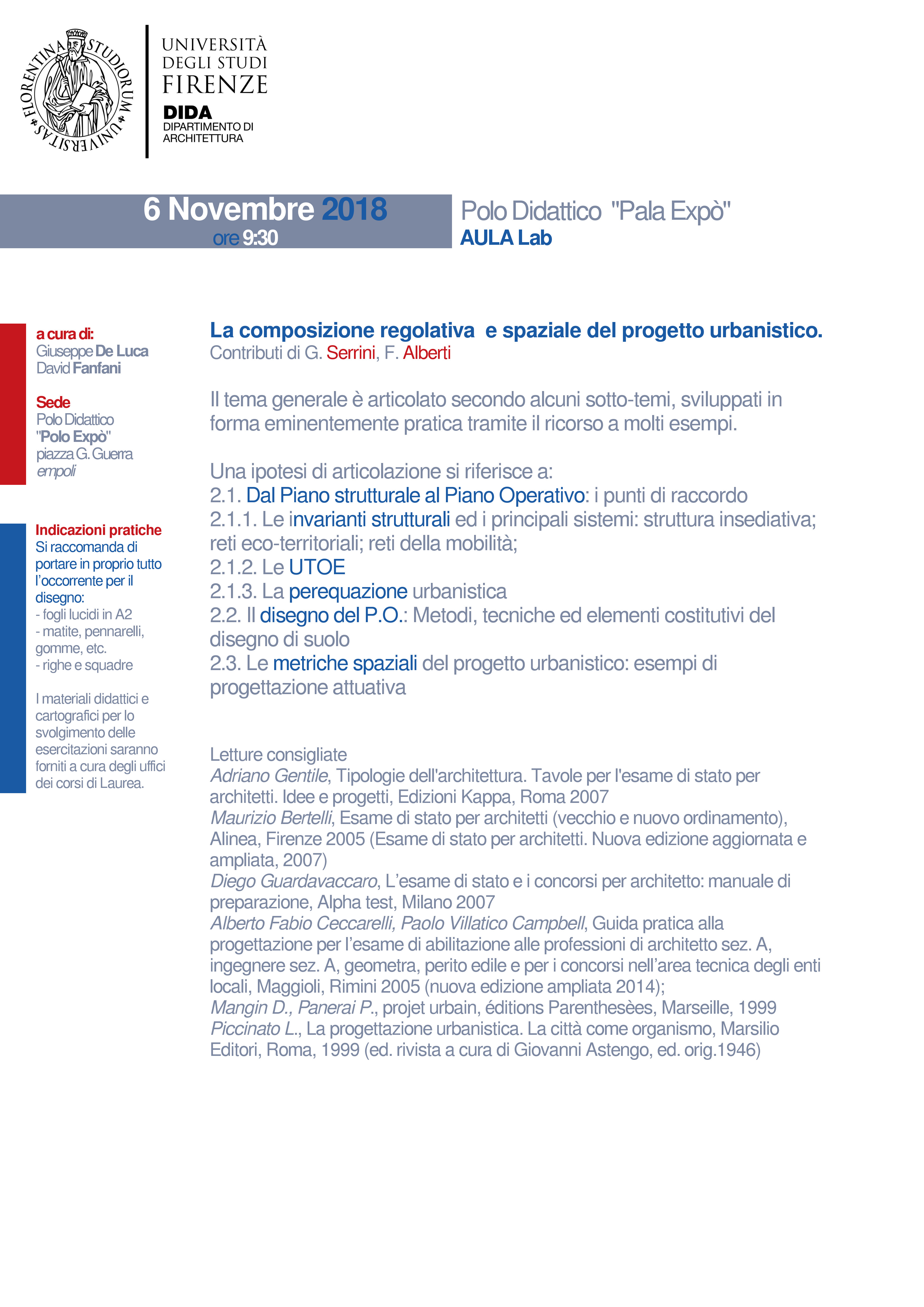 Le attività teorico-pratiche si articoleranno sulla giornate di lunedì 5 e martedì 6 Novembre dalle ore 9:30 alle 18:30, destinando le mattinate ad incontri a carattere teorico sugli argomenti oggetto d'esame.