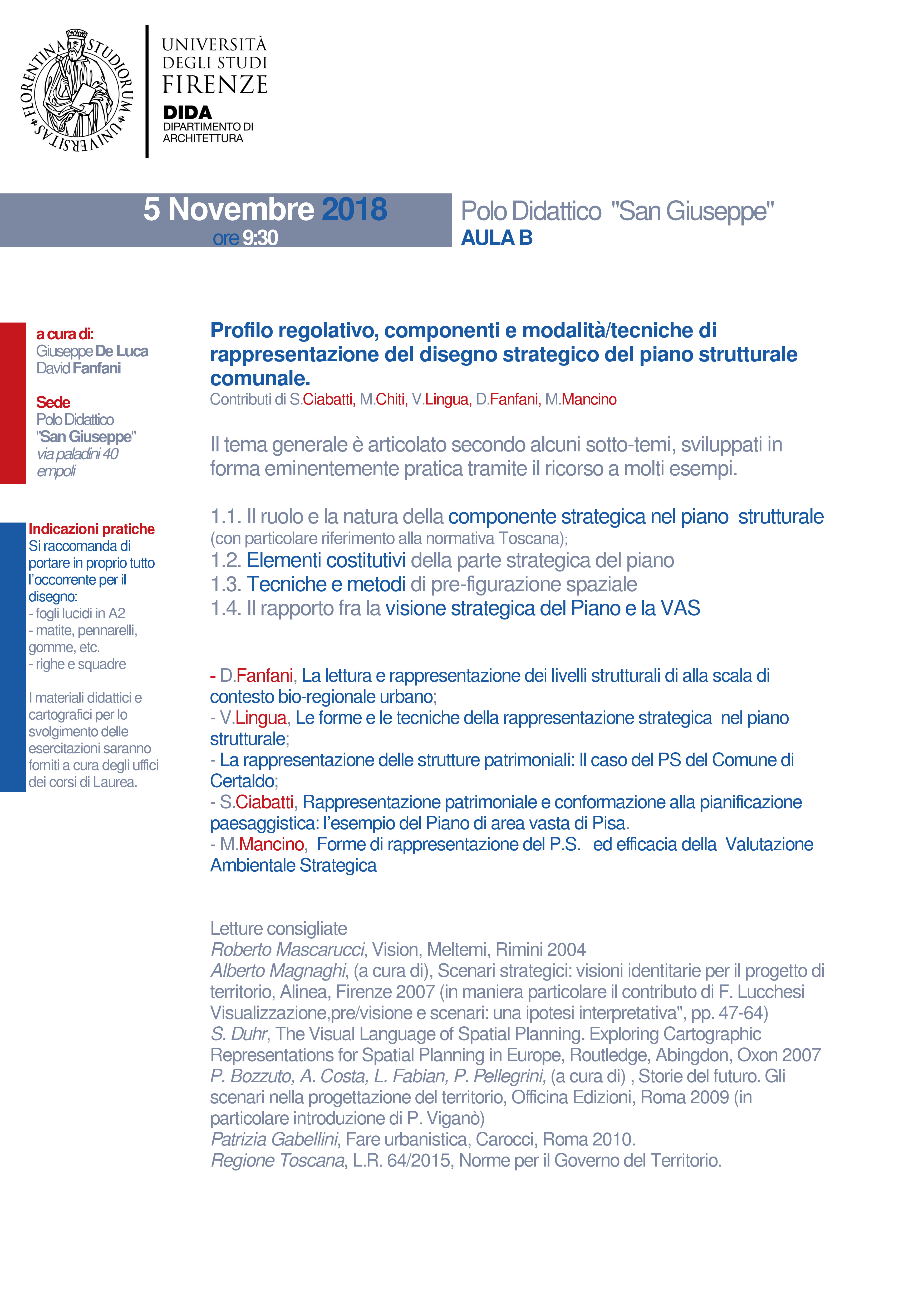 Le attività teorico-pratiche si articoleranno sulla giornate di lunedì 5 e martedì 6 Novembre dalle ore 9:30 alle 18:30, destinando le mattinate ad incontri a carattere teorico sugli argomenti oggetto d'esame.